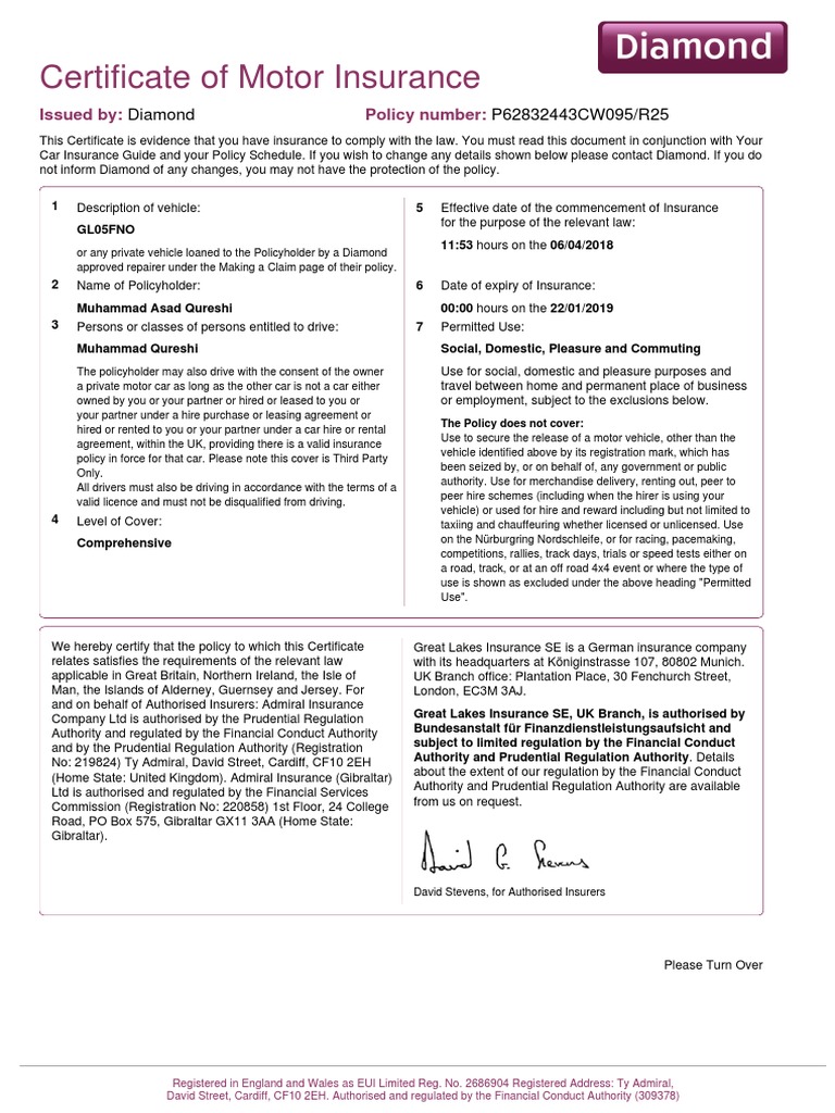 Admiral Car Insurance Cover Note